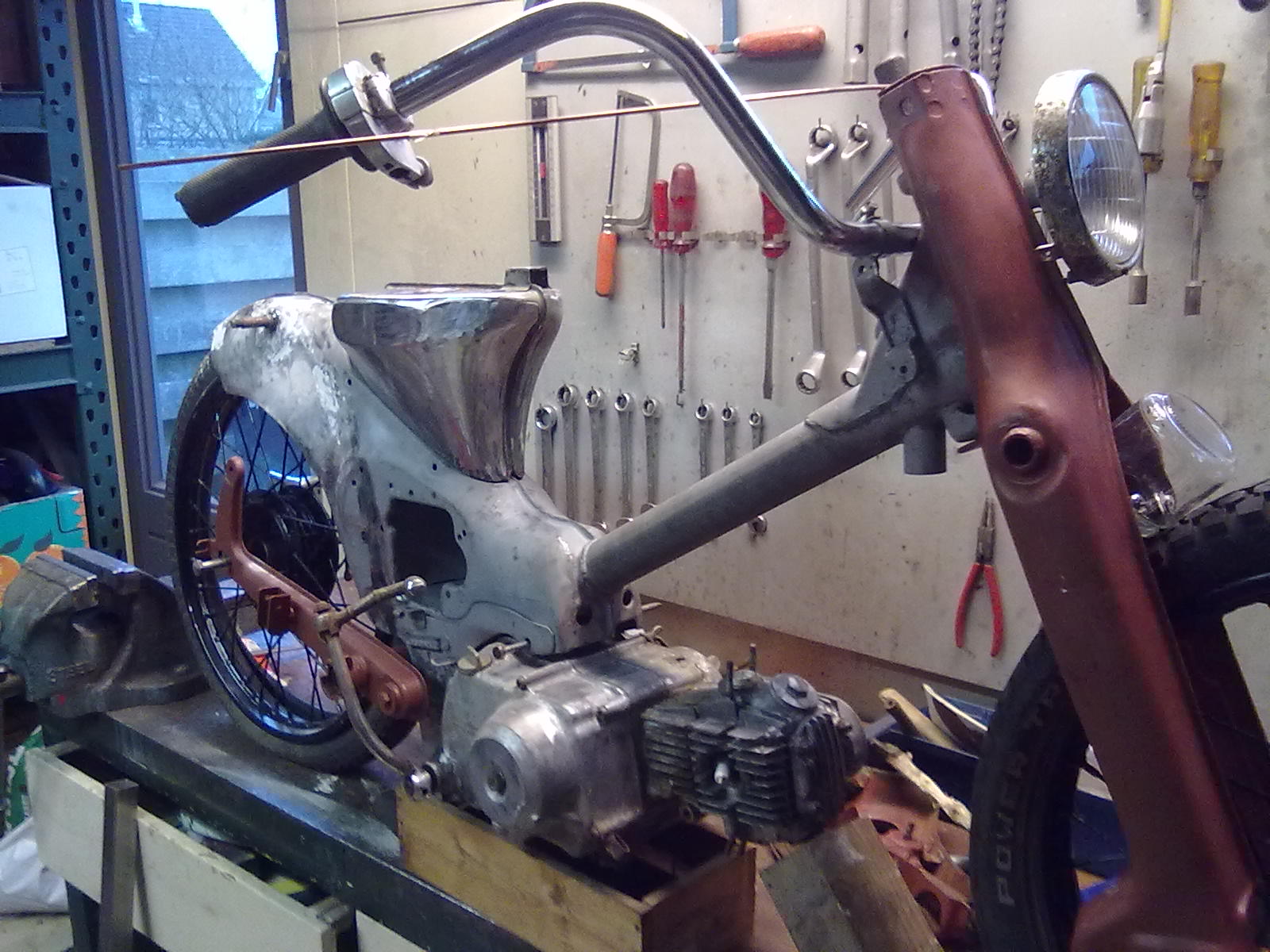 Toen ik hem kocht werd mij verteld dat hij niet rot was, later thuis achter gekomen dat er meer plamuur dan metaal aan zat, dus dat (Nederlands) frame werd onbruikbaar voor dit project.