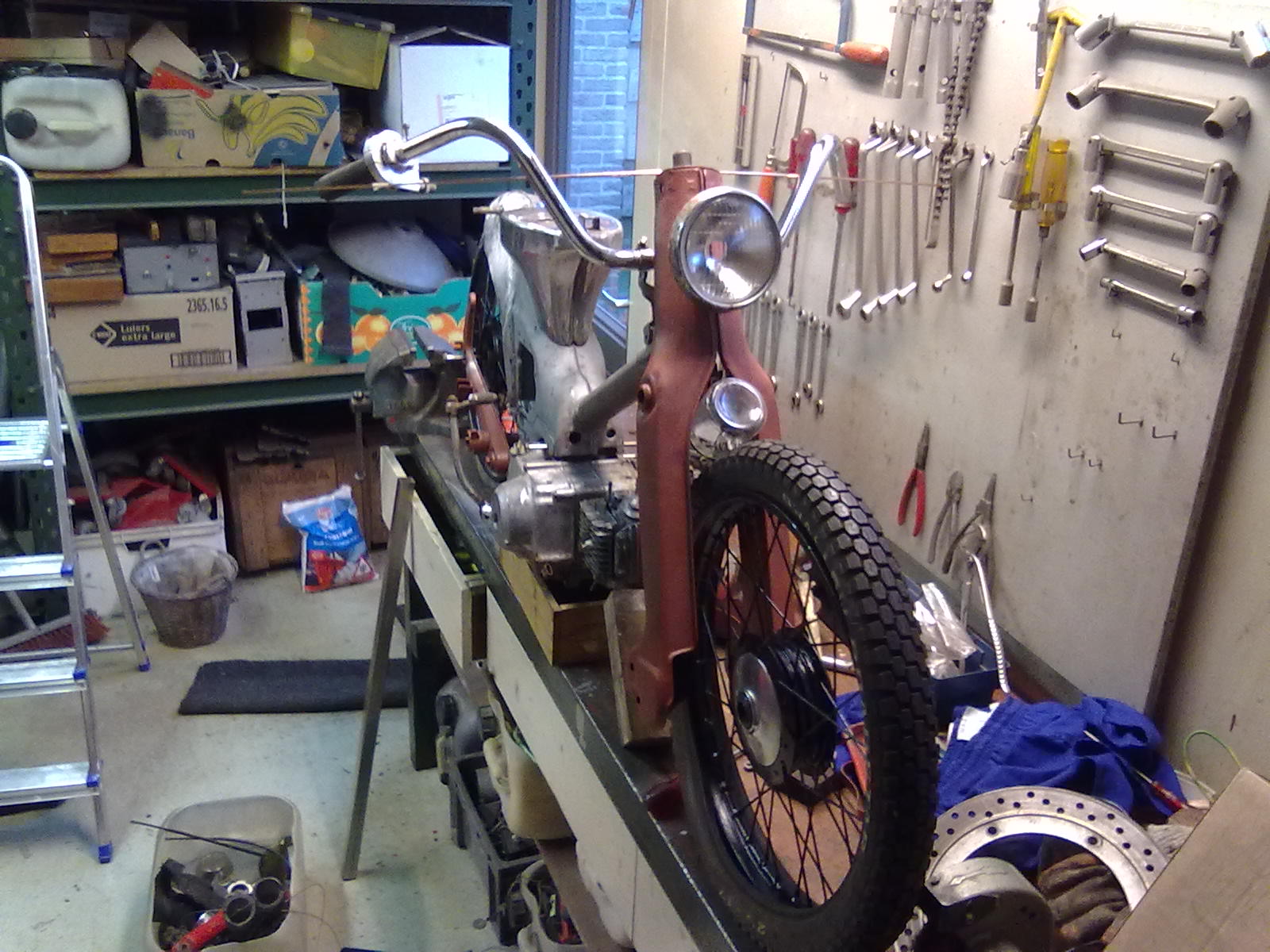Ik ben nu bezig om het frame strak te maken voor het spuiten, de kleur moet ik nog even over nadenken, maar ik denk wel dat het een matte kleur wordt.